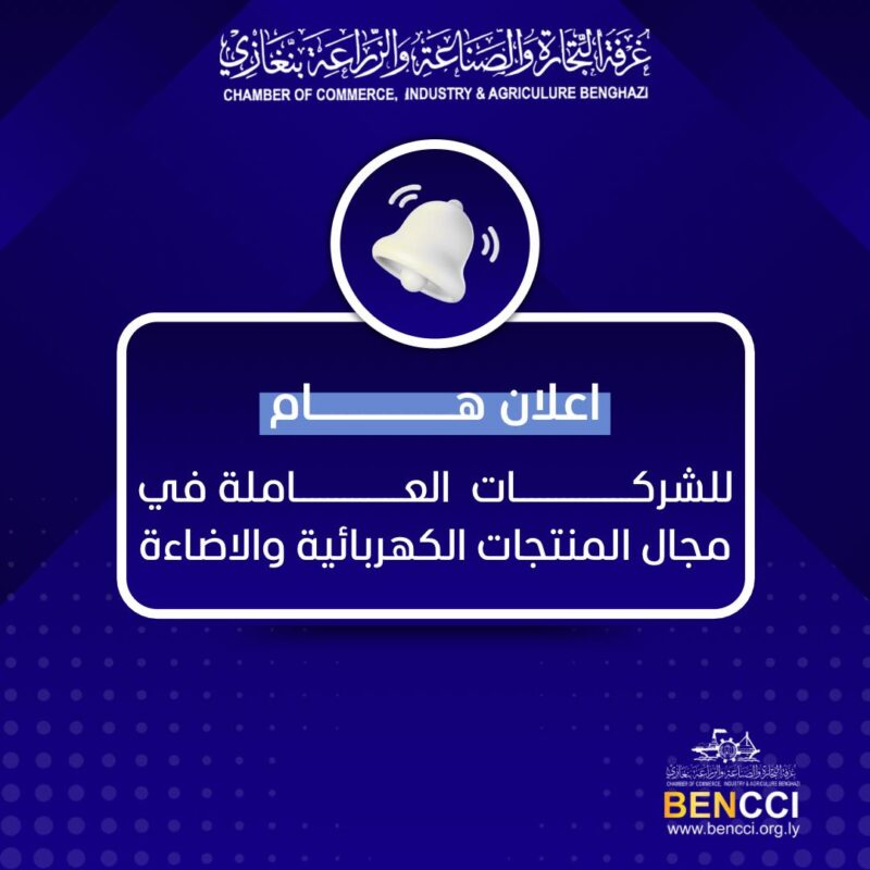 | تُعلن غرفة التجارة والصناعة والزراعة – بنغازي، وتدعو السادة المنتسبين من الشركات العاملة في مجال...