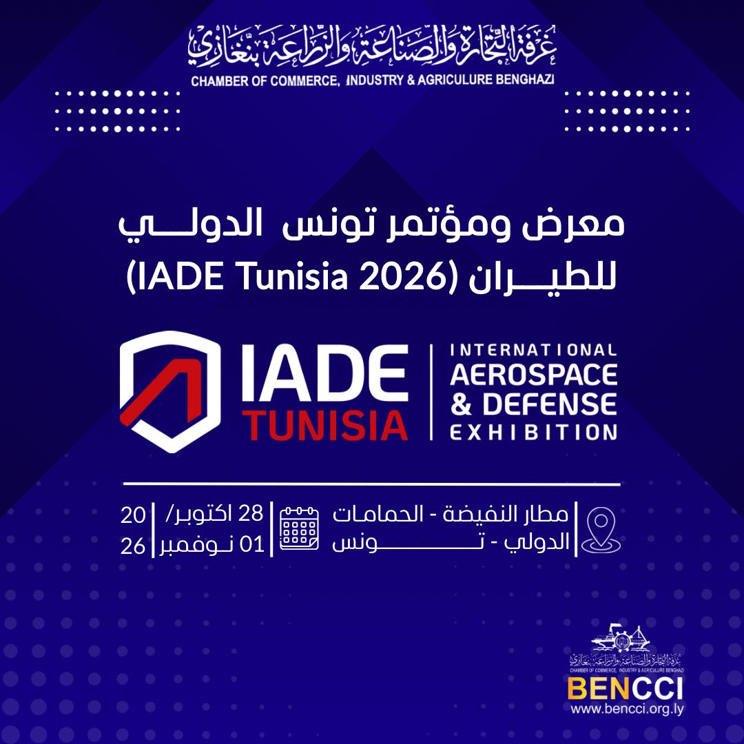 | تدعو غرفة التجارة والصناعة والزراعة – بنغازي السادة المنتسبين من الشركات والمؤسسات ورجال الأعمال، للمشاركة في معرض ومؤتمر تونس الدولي للطيران (IADE Tunisia 2026)، والذي سيُقام خلال الفترة من 28 أكتوبر إلى 1 نوفمبر 2026، بمطار النفيضة – الحمامات الدولي بالجمهورية التونسية.