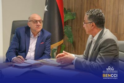 | في إطار متابعة وحل المختنقات والأزمات الميدانية، اجتمع اليوم الخميس 2026/4/9 الفريق عبد الباسط ابوغريس رئيس لجنة الأزمات الخاصة بالوقود والغاز والسلع التموينية، مع السيد منعم ناجي السعيطي رئيس مجلس إدارة غرفة التجارة والصناعة والزراعة بنغازي المكلف، بحضور المهندس رمضان توفيق بوبطانه مدير الإدارة الاقتصادية والعلاقات الدولية بالغرفة، للاطلاع على أبرز المعوقات والعراقيل التي تمر بها البلاد في الفترة الحالية، وأهمها ارتفاع الأسعار.